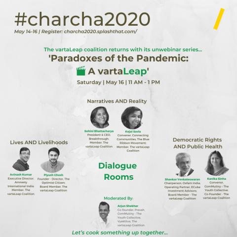 Paradoxes of the Pandemic: A vartaLeap was an (un)webinar where participants came together to unearth the paradoxes of Lives & Livelihoods, Narratives & Reality and Democratic Rights & Public Health (in COVID times) through a learning dialogue with 7 inter-generational expert moderators - Shankar Venkateswaran (Chairperson, Oxfam India; Operating Partner, ECube Investment Advisors), Avinash Kumar (Executive Director, Amnesty International India), Sohini Bhattacharya (President & CEO, Breakthrough), Kejal Salva (Convener, Connecting Communities, The Blue Ribbon Movement), Piyush Ghosh (Founder - Director, The Optimist Citizen) Kanika Sinha (Convener, ComMutiny - The Youth Collective; Co-founder, The vartaLeap Coalition) and Arjun Shekhar (Co-founder, Pravah, ComMutiny - The Youth Collective, Vyaktitva, The vartaLeap Coalition). Learn about the recommendations for the government and youth here: shorturl.at/lUV16