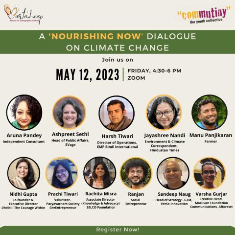 We invite you to join a Nourishing Now dialogue on Climate Change on 12th May, Friday, 4:30-6 PM. The online dialogue will bring together Climate Leaders, Young Changemakers and diverse stakeholders to talk about how to build a nourishing approach to climate change.