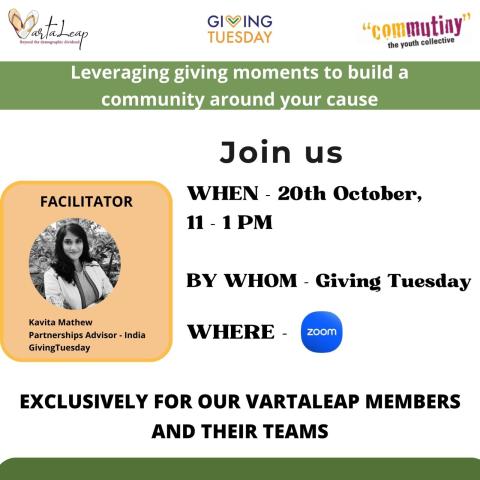 We are thrilled to share that Giving Tuesday is offering a session on fundraising exclusively for vartaLeap members and their teams. This training programme is designed to provide individuals and organisations with the knowledge and skills  necessary to leverage giving moments effectively to build community and meet resource mobilization needs.